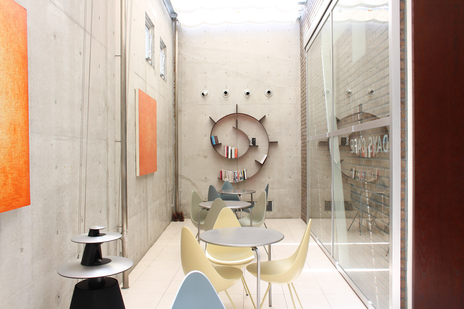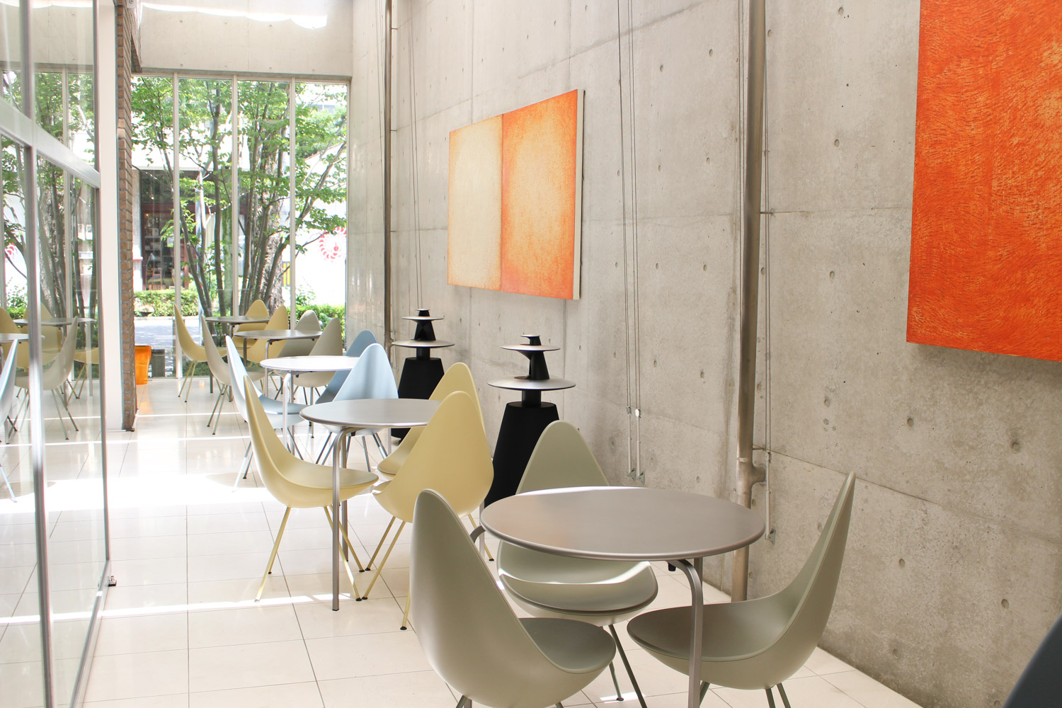 丸っこい椅子は、ロビーに置いてあった青い椅子と同じ、アルネ・ヤコブセンがデザインした「DROP」(通称:ドロップチェア)。