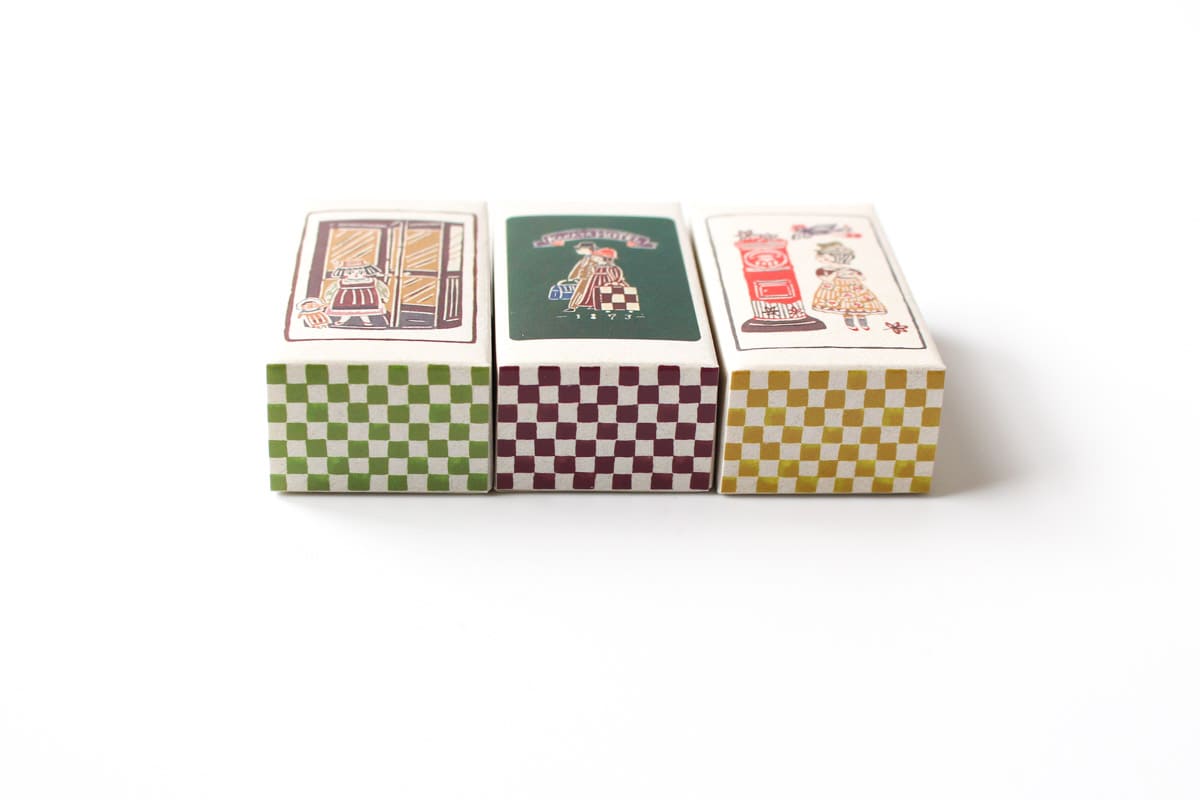 小箱1つはマッチ箱くらいの大きさで、デザインには別のオリジナルギフトのトランプの絵柄が使われていました。