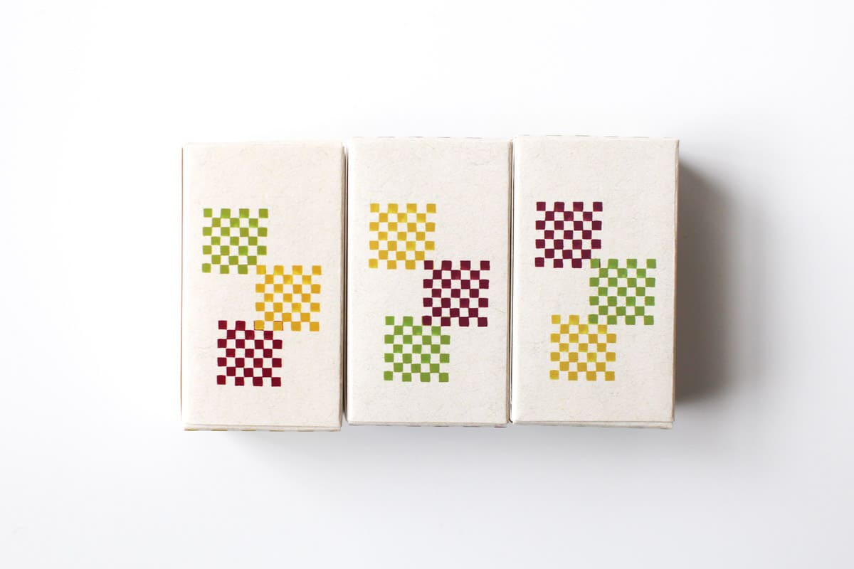 外箱はとてもシンプル。羊羹の断面のような四角がチェック柄のように並んでいて、上品なかわいさがあります。