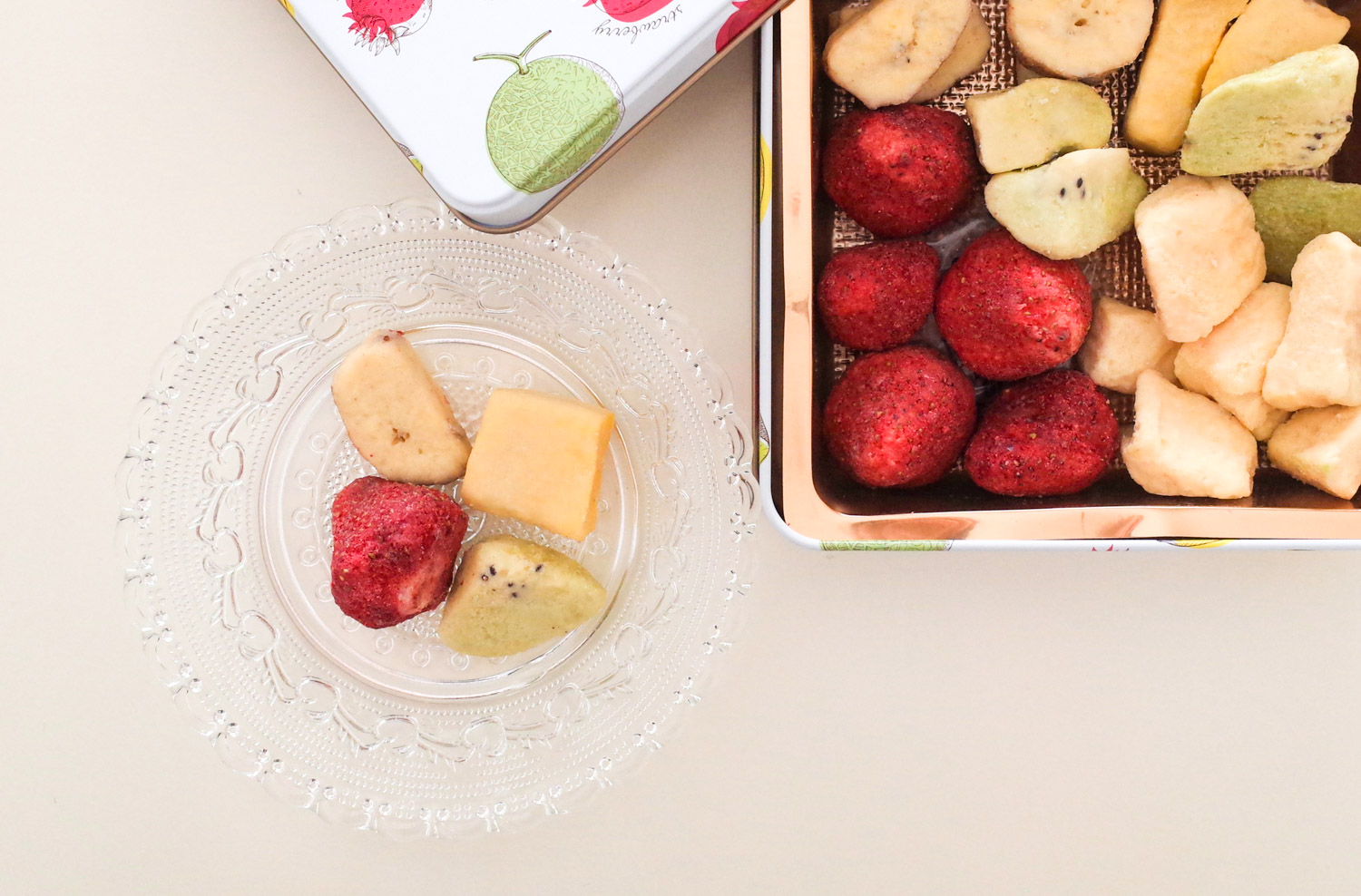 一番人気は〈メリメロ〉という名の商品で、ストロベリー、バナナ、メロン、キウイ、マンゴーの5種類の詰め合わせ。フリーズドライのフルーツの食感もそれぞれ異なり、1缶で楽しめるところが人気なようです。