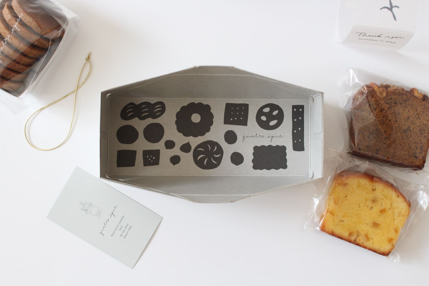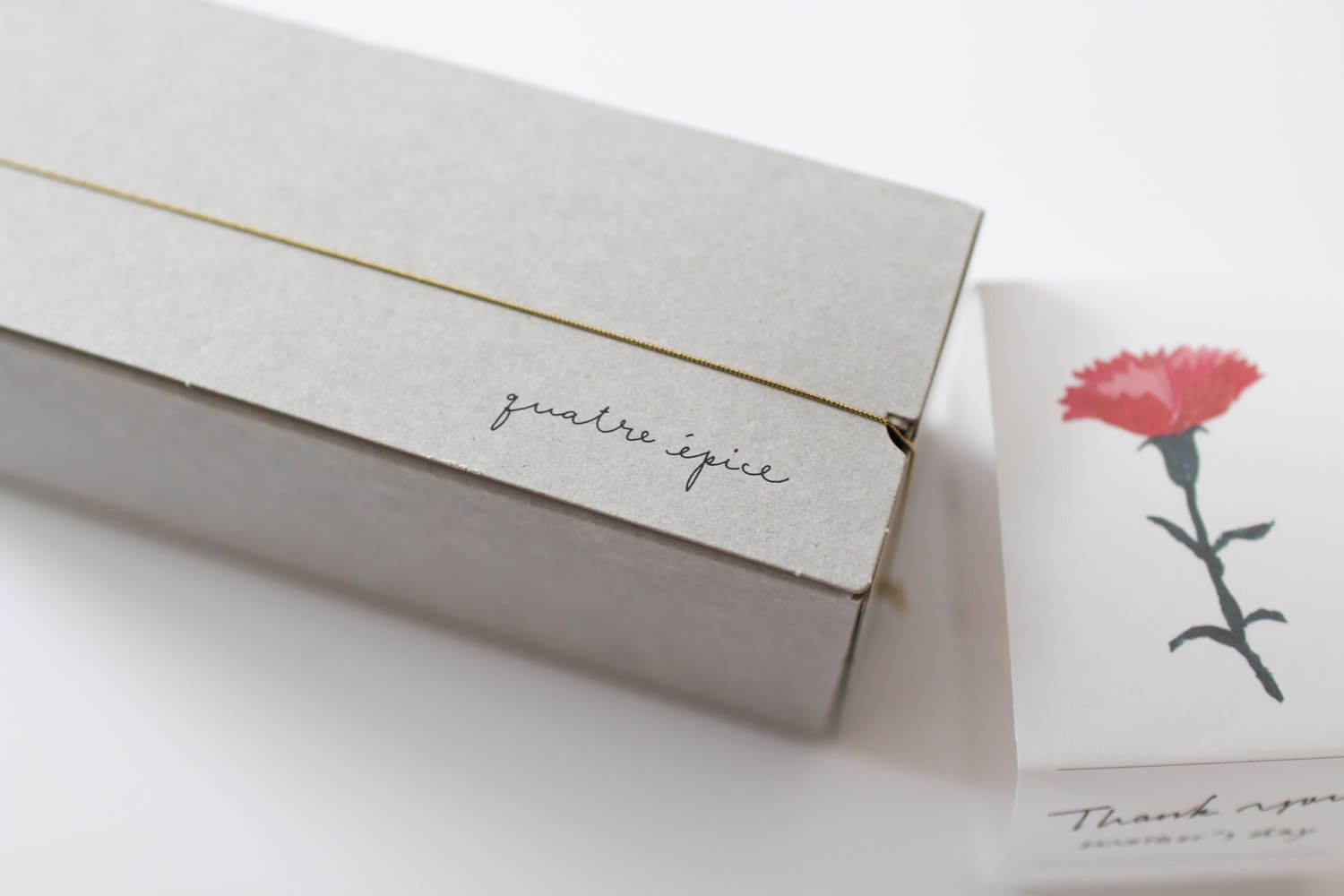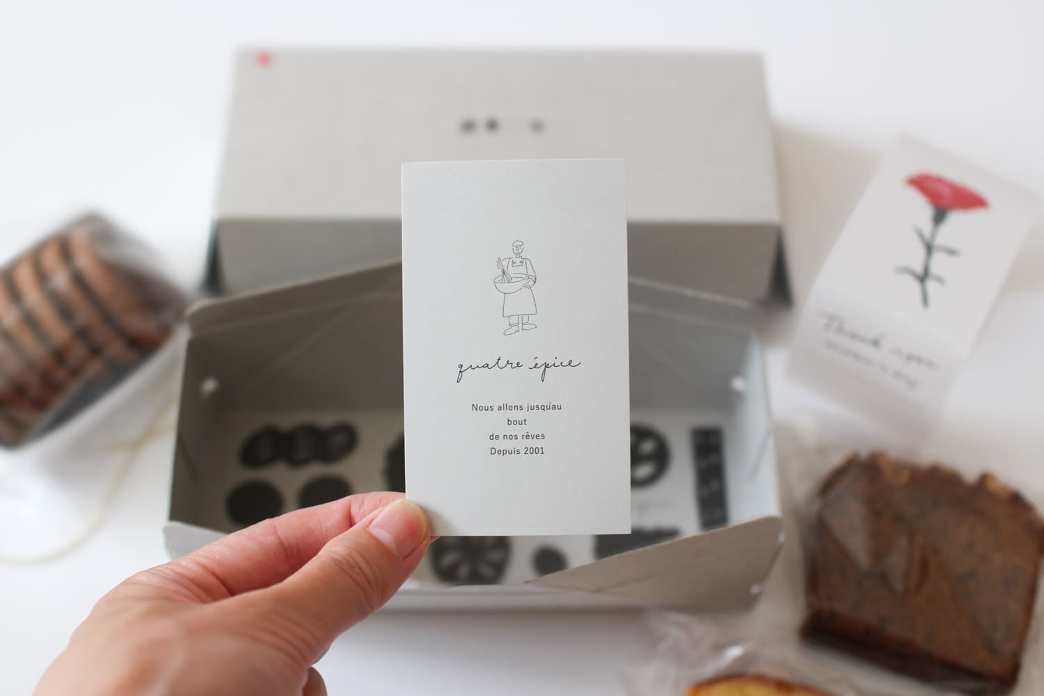 静岡の洋菓子店 quatre epice(キャトルエピス)の母の日パッケージのお菓子とジャム 2024.5.12 Date 収集日 2024年5月 URL https://www.quatre-epice.com/ 場所静岡県モチーフお菓子花素材—カテゴリお菓子ジャム食べものタグ—カラーグレー クレジット イラスト:深澤みなみさん