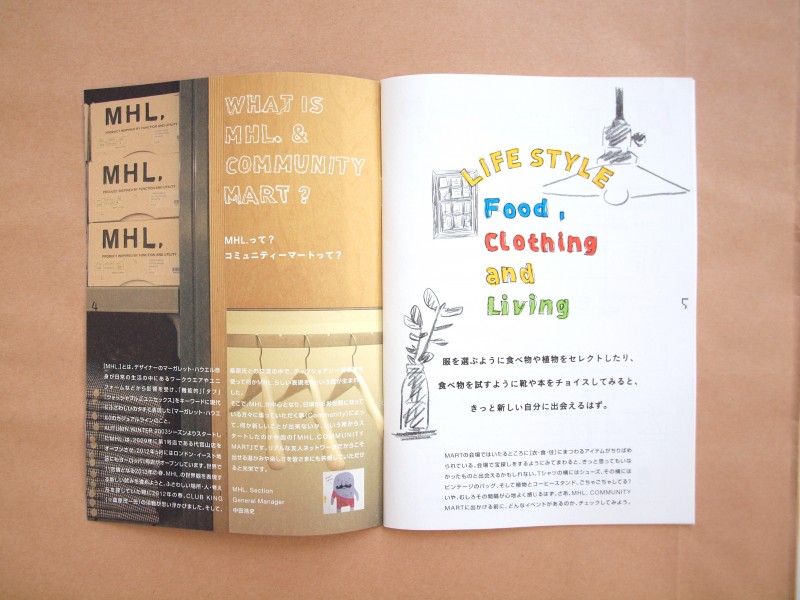 MHL主催のイベント「COMMUNITY MART MHL VOL.1」のガイドブック アパレルのブランド、MARGARET HOWELL (マーガレット・ハウエル) 主催でいろんなお店を集めたマーケット「COMMUNITY MART MHL VOL.1」のガイドブック。 MHLだけに載っているお店がみんなステキです。 2013.3.12 Date 収集日 URL 場所東京都モチーフ—素材—カテゴリ紙ものタグ—カラー— クレジット