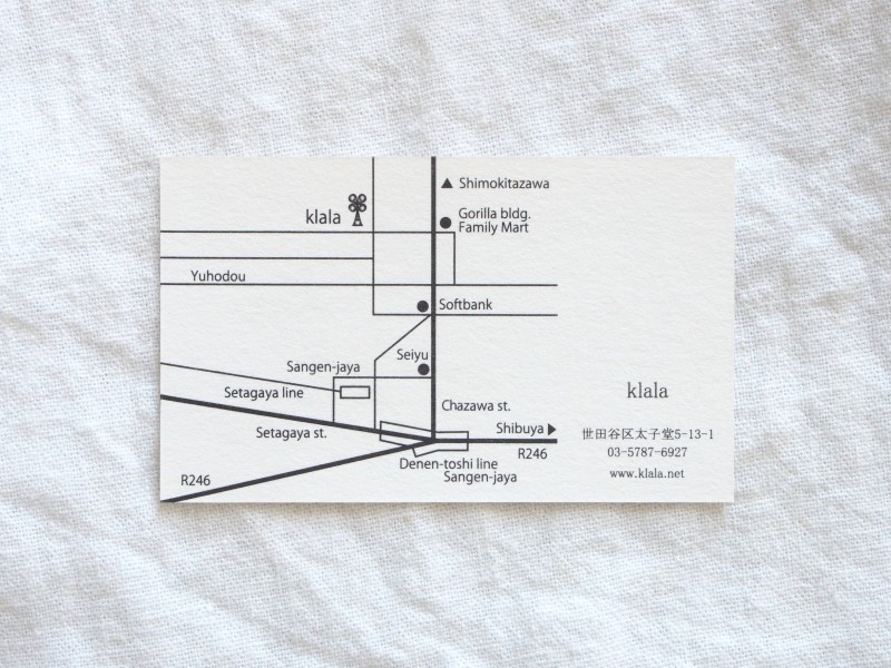 三軒茶屋の雑貨屋さん「klala」のショップカード 三軒茶屋にある、北欧ビンテージ、器や雑貨を扱うお店「klala」のショップカード。 お店自体は小さいけど、とても厳選された商品が並んでました。 2013.4.9 Date 収集日 URL 場所東京都モチーフ—素材—カテゴリショップカード紙ものタグ—カラー— クレジット