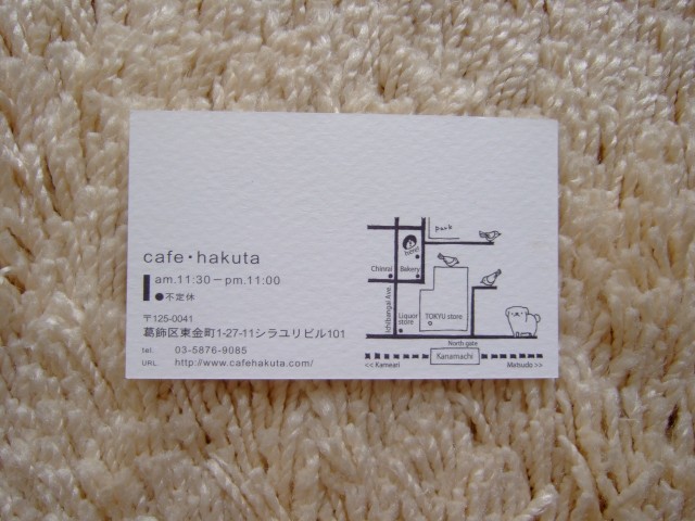 東京金町にあるカフェ「cafe hakuta」のショップカード ▶ cafe hakuta 2012.1.28 Date 収集日 URL 場所東京都モチーフ—素材—カテゴリショップカードカフェ紙ものタグ—カラーホワイト クレジット