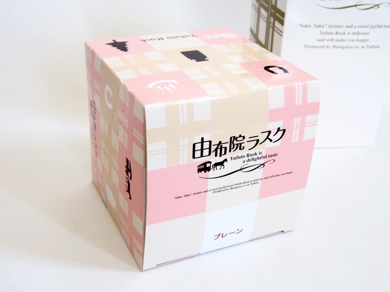 布っぽい柄でキューブ型パッケージがかわいい「由布院ラスク」